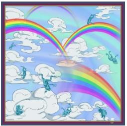 The Weather R pattern is inspired by Weather R’s ability to freely manipulate the weather. It depicts clouds and a rainbow in the sky, with frogs raining down from various directions, framed by an image of Weather R’s belt.