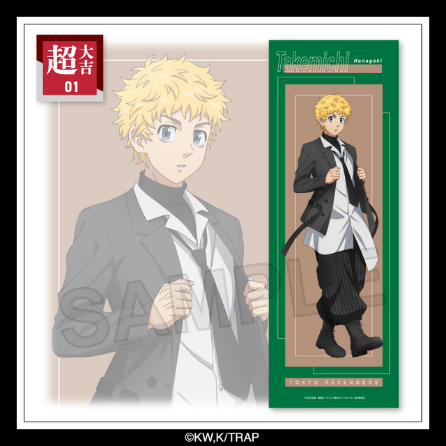 From the TV anime Tokyo Revengers, characters like Hanagaki Takemichi are making an appearance in the online lottery service “Marukuji” with a stylish monotone look. A range of appealing prizes are available, from Chou Daikichi (Super Great Luck) down to Suekichi (Minor Luck).