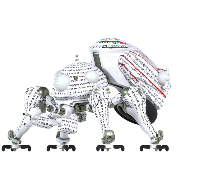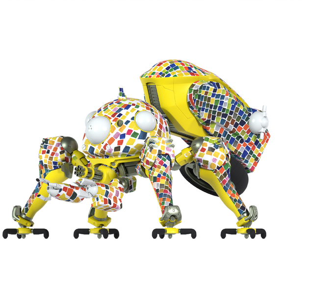 For this exciting collaboration, the beloved Tachikoma — a charming and highly intelligent multi-legged tank from the *Koukaku Kidoutai* anime series — has been given a stunning makeover. The iconic design of the Tachikoma from *Koukaku Kidoutai SAC_2045* is now wrapped in vibrant original art created by four talented HERALBONY contracted artists.