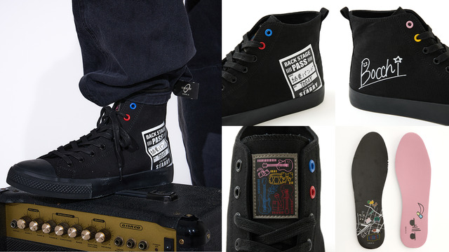 These sneakers come with a special “kessoku band” cable tie featuring the Kessoku Band logo, which can be attached wherever you like. The left shoe features a backstage pass design, while the right proudly displays Bocchi-chan’s signature. The shoelace eyelets and tongue are accented with the individual character colors of the Kessoku Band members. The asymmetrical design extends to the insoles, each with a different pattern, ensuring these sneakers make a bold fashion statement.