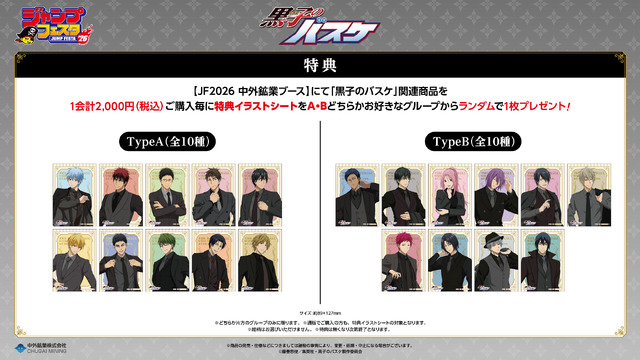 If you’re attending Jump Festa 2026, you can find these exciting goods at the Chugai Mining booth, located in Exhibition Hall 10 of Makuhari Messe International Exhibition Hall. As a special treat, for every 2,000 JPY (tax included) spent on *Kuroko no Basuke* JF2026-related merchandise in a single transaction at the booth, you’ll receive a bonus “Illustration Sheet” – a perfect keepsake!