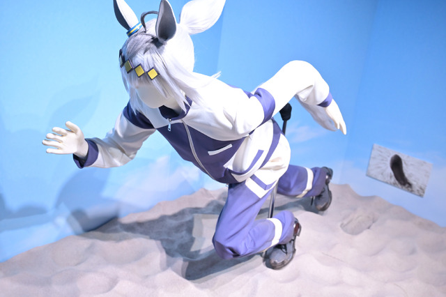 A mannequin recreating Oguri Cap’s forward-leaning running posture perfectly captures the depth of her stride. There’s also a display of Oguri Cap & Tamamo Cross’s “shoubu-fuku” (racing outfits), allowing for appreciation of the fine details. The starting gate the Uma Musume enter before a race is also recreated, and you can actually step inside it to take commemorative photos.